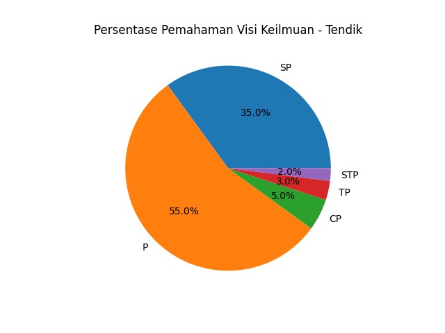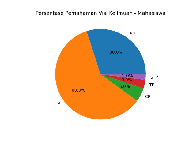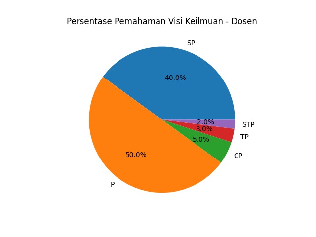 Pada kelompok dosen, tingkat pemahaman menunjukkan capaian yang sangat baik, dengan 50% responden berada pada kategori Paham (P) dan 40% pada kategori Sangat Paham (SP). Sementara itu, 5% berada pada kategori Cukup Paham (CP), 3% Tidak Paham (TP), dan 2% Sangat Tidak Paham (STP). Data ini mengindikasikan bahwa mayoritas dosen telah memahami visi keilmuan secara komprehensif, yang menjadi modal penting dalam pelaksanaan pembelajaran, penelitian, dan pengabdian kepada masyarakat. Pada kelompok mahasiswa, hasil survei menunjukkan bahwa 60% responden berada pada kategori Paham (P) dan 30% pada kategori Sangat Paham (SP). Adapun 5% berada pada kategori Cukup Paham (CP), 3% Tidak Paham (TP), dan 2% Sangat Tidak Paham (STP). Temuan ini mencerminkan bahwa mahasiswa sebagai subjek utama proses pendidikan telah memiliki tingkat pemahaman yang baik terhadap visi keilmuan, meskipun masih diperlukan penguatan pada sebagian kecil mahasiswa yang belum memahami secara optimal. Selanjutnya, pada kelompok tenaga kependidikan, diperoleh bahwa 55% responden berada pada kategori Paham (P) dan 35% pada kategori Sangat Paham (SP), dengan 5% pada kategori Cukup Paham (CP), 3% Tidak Paham (TP), dan 2% Sangat Tidak Paham (STP). Hal ini menunjukkan bahwa tenaga kependidikan juga memiliki pemahaman yang baik terhadap visi keilmuan, yang berperan dalam mendukung layanan akademik dan administrasi secara selaras dengan arah pengembangan program studi.